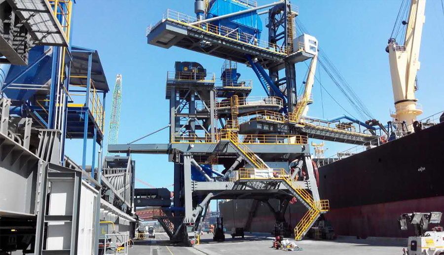 無軌道移動式裝船機,行走裝置有輪胎、履帶兩個系列,物料進入裝船機的方式有:1)自卸卡車直接倒料的進料裝置,每套進料裝置的接受能力為625m3/h,弧形懸臂式可配置兩套進料裝置,裝船能力達到1200m3/h,塔式可配置四套進料裝置,裝船能力達到2400m3/h;2)裝載機進料的料倉;3)皮帶機進料的料斗。有軌道移動式裝船機,如圓弧軌道式、直線軌道式、前直線軌道擺動和后直線軌道擺動。對于水文落差較大的碼頭,采用在浮式躉船安裝1-2臺圓弧軌道式,直線軌道式需要配置相應的尾車輸送機,擺動式裝船機適用于環(huán)保要求較高的碼頭,采用大跨距的回轉(zhuǎn)橋架,完成長大艙口的覆蓋面積。對于船型很小或移船方便的碼頭,為減少投資,可選用墩座式裝船機。袋包裝船有螺旋滑槽式和托輥式。